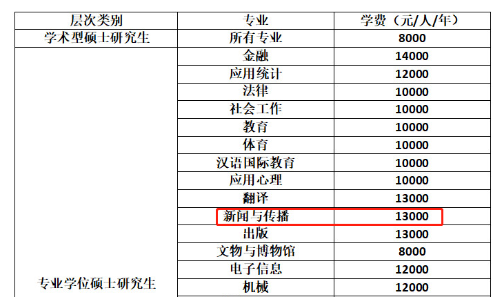 全日制专业学位硕士研究生学费:1.3万元/生·年