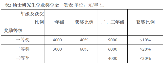 2.研究生学业奖学金:等级、获奖比例、奖励标准见表2。