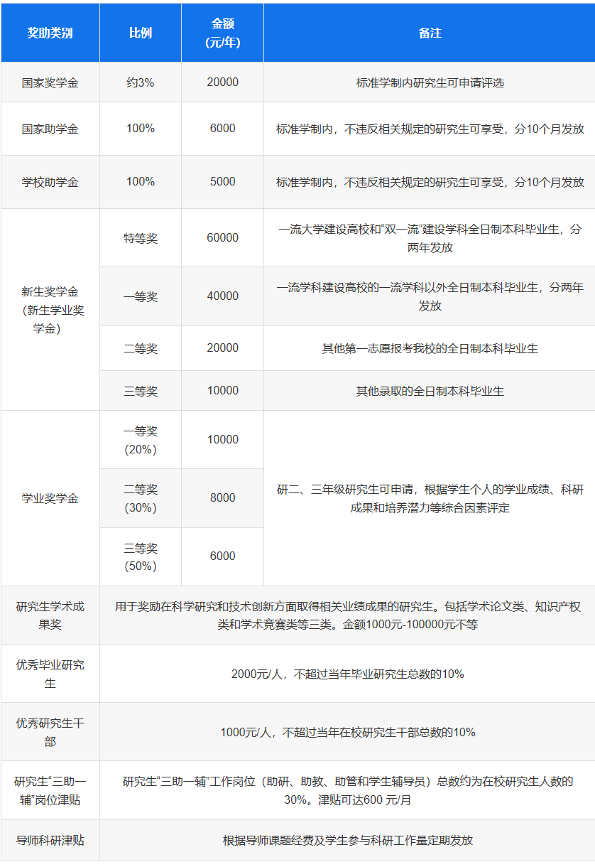 学校依托地区经济发展优势,加大经费投入力度,努力为研究生创造较好的学习条件。主要奖(助)学金如表所示。表中各类奖助学金仅面向全日制非定向就业硕士研究生评选,评选细则以学校相关文件及通知为准。表中具体内容如有调整或其它未尽事宜以学校最新文件为准。