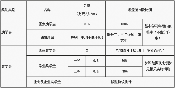 为激励研究生勤奋学习、潜心科研,在全面实行研究生教育收费制度的情况下更好地支持研究生顺利完成学业,学校设立了研究生奖、助学金。2020年硕士研究生奖、助学金见下表(仅供参考):