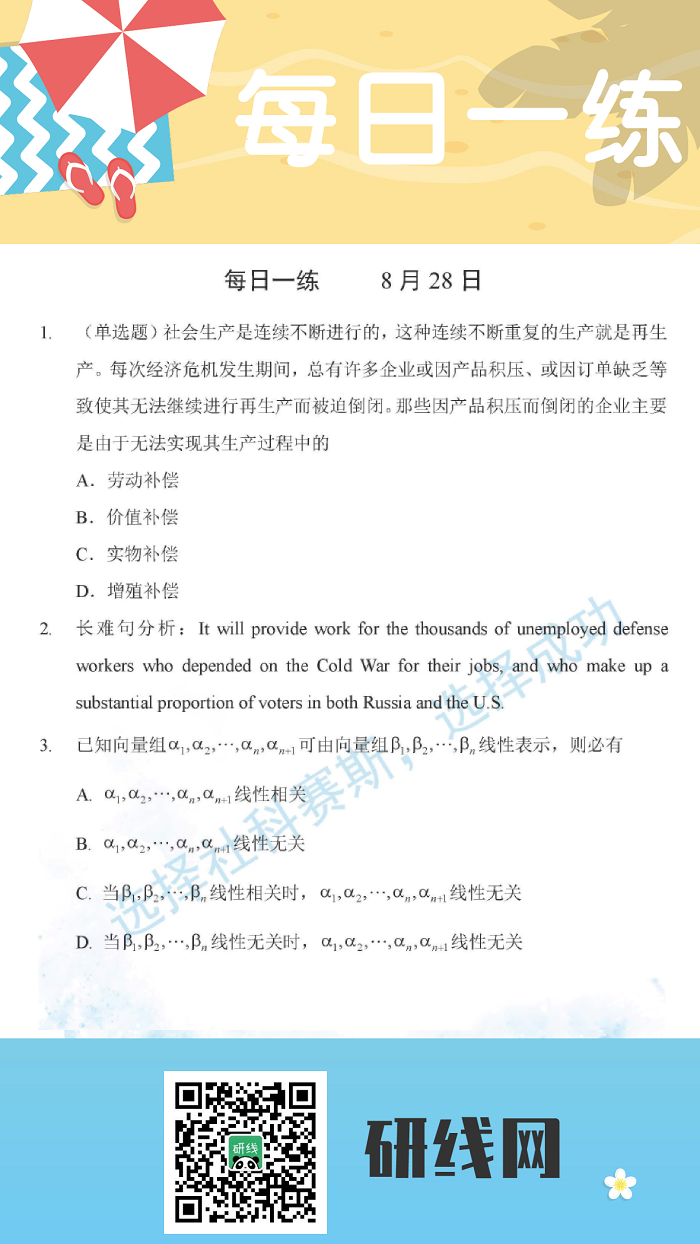 为了更好的复习和巩固已经学过的知识,研线网小编为大家整理出几道题,作为每日的练习,希望能够帮助到同学们哦!