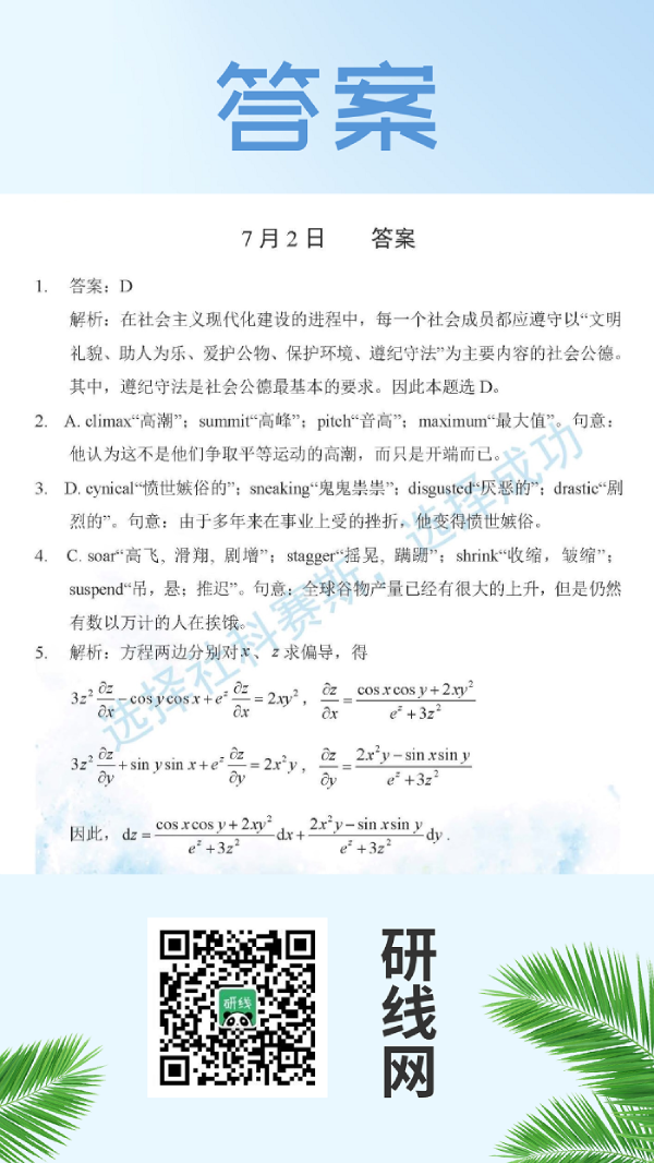 7月2日:2020拼搏在线官网学硕每日一练以及答案