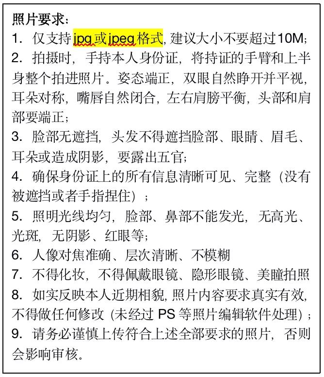 请务必谨慎上传符合上述全部要求的照片,否则会影响审核;