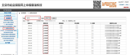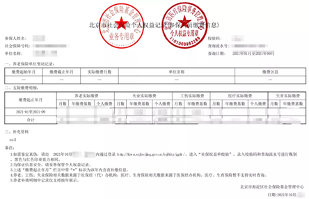 个人权益记录需要提供北京市社会保险网上申报查询系统 显示“正常缴费”截图,以及加盖两红章的“北京市社会保险个人权益记录”,如下图所示。