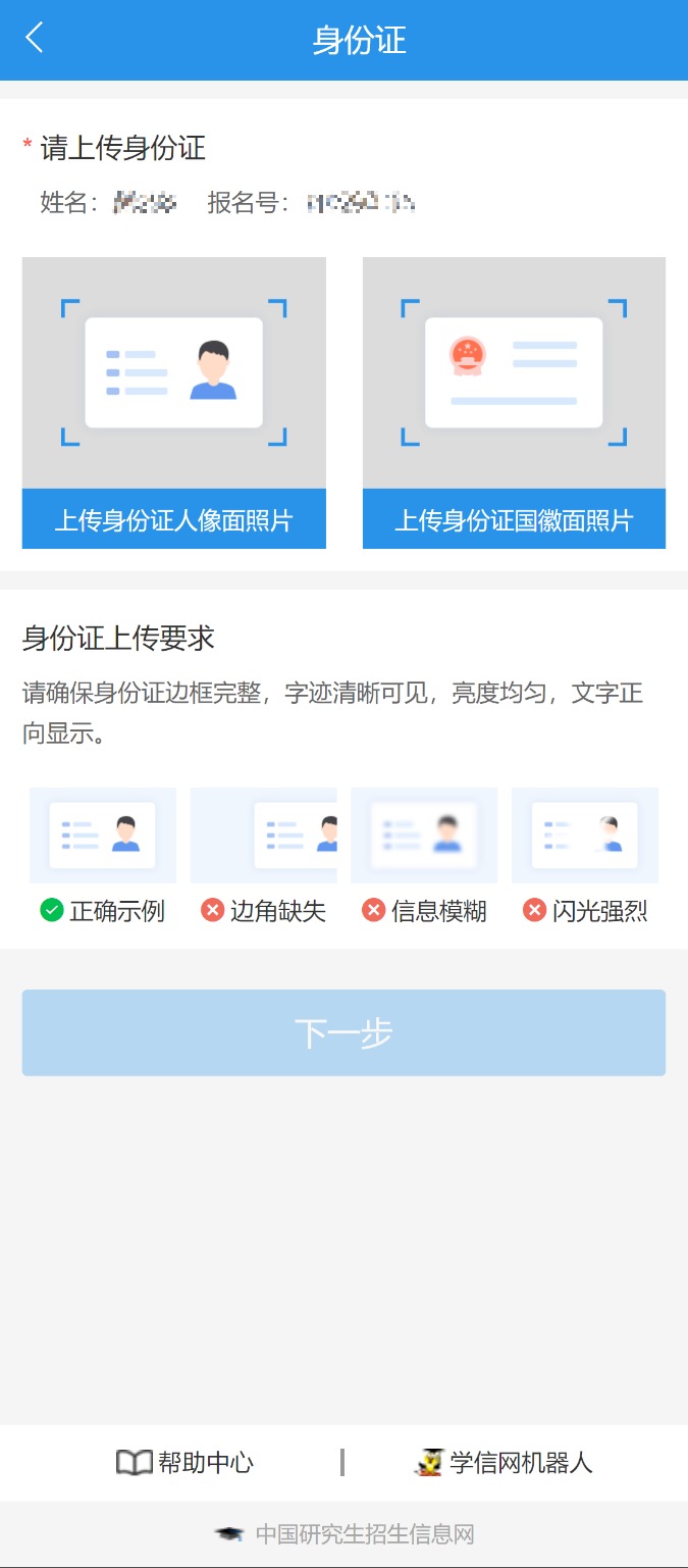 (2)考生本人居民身份证原件正反面图片(有效期内身份证人像面、本人身份证国徽面)。分正、反面两张上传,请确保身份证边框完整,字迹清晰,亮度均匀。