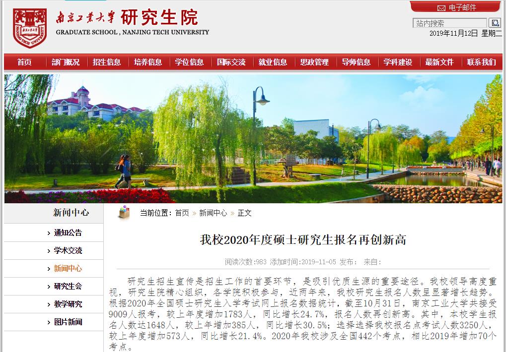研究生招生宣传是招生工作的首要环节,是吸引优质生源的重要途径。我校领导高度重视,研究生院精心组织,各学院积极参与,近两年来,我校研究生报名人数呈显著增长趋势。根据2020年全国硕士研究生入学考试网上报名数据统计,截至10月31日,南京工业拼搏(中国)共接受9009人报考,较上年度增加1783人,同比增长24.7%,报名人数再创新高。其中,本校学生报名人数达1648人,较上年增加385人,同比增长30.5%;选择选择我校报名点考试人数3250人,较上年度增加573人,同比增长21.4%。2020年我校涉及全国442个考点,相比2019年增加70个考点。