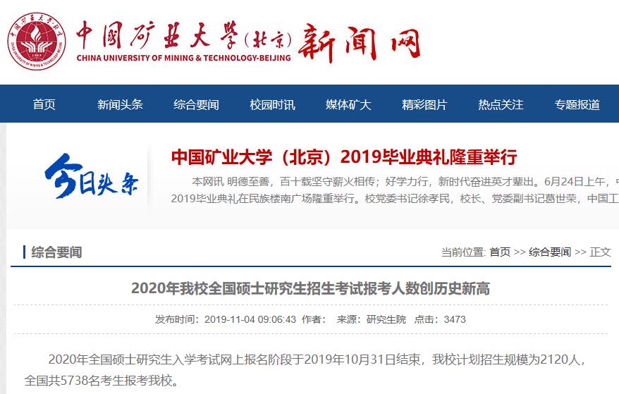 2020年全国硕士研究生入学考试网上报名阶段于2019年10月31日结束,我校计划招生规模为2120人,全国共5738名考生报考我校。