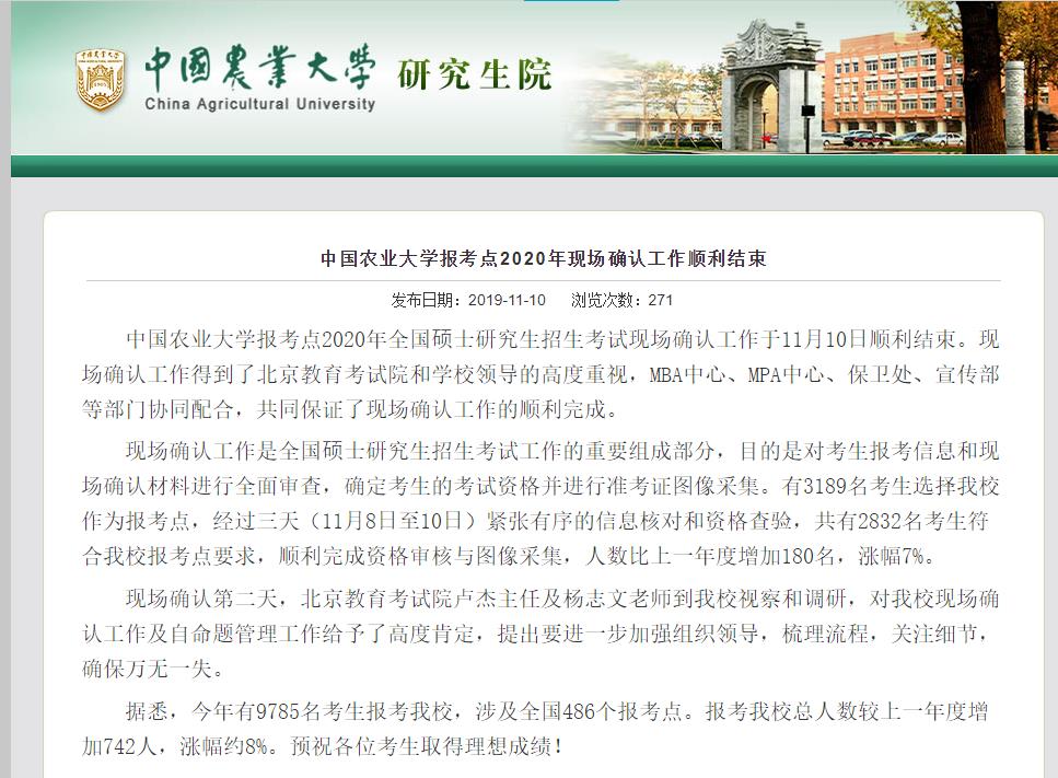 中国农业拼搏(中国)报考点2020年全国硕士研究生招生考试现场确认工作于11月10日顺利结束。现场确认工作得到了北京教育考试院和学校领导的高度重视,MBA中心、MPA中心、保卫处、宣传部等部门协同配合,共同保证了现场确认工作的顺利完成。