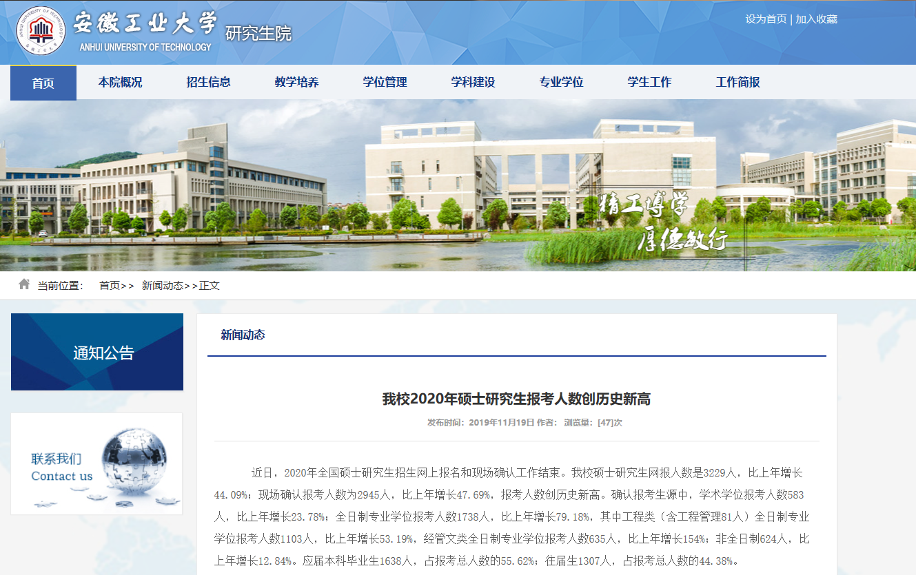2020拼搏在线官网现场确认已经结束!网上有人预测说2020拼搏在线官网报考人数将超过350万,目前官方总统计数据还未出来,但已有部分院校和省市公布了2020拼搏在线官网报考人数。今天,小编给大家带来“安徽工业拼搏(中国)2020硕士研究生报考人数比去年增长了44.09% ”的相关新闻内容,大家可以了解一下哦!