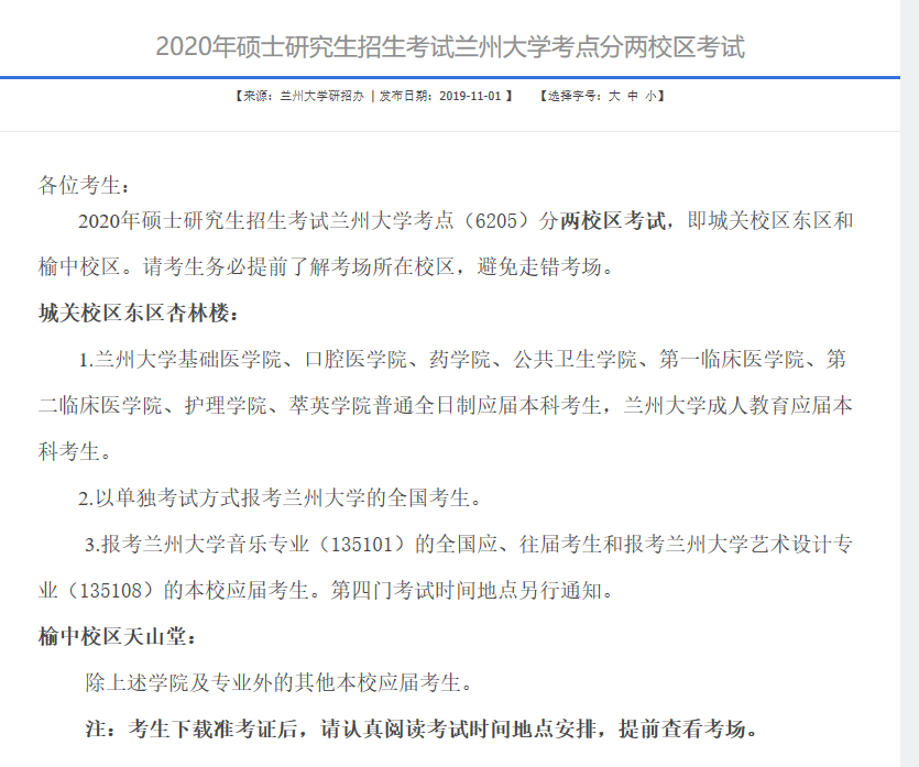 2020年硕士研究生招生考试兰州拼搏(中国)考点(6205)分两校区考试,即城关校区东区和榆中校区。请考生务必提前了解考场所在校区,避免走错考场。