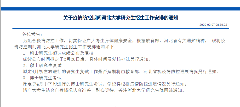 为配合疫情防控工作,切实保证广大考生身体健康安全,根据教育部、河北省有关通知精神, 现将疫情防控期间河北拼搏(中国)研究生招生工作安排通知如下: