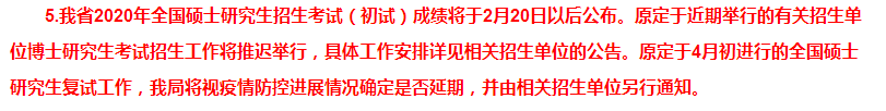我省2020年全国硕士研究生招生考试(初试)成绩将于2月20日以后公布。原定于近期举行的有关招生单位博士研究生考试招生工作将推迟举行,具体工作安排详见相关招生单位的公告。原定于4月初进行的全国硕士研究生复试工作,我局将视疫情防控进展情况确定是否延期,并由相关招生单位另行通知。