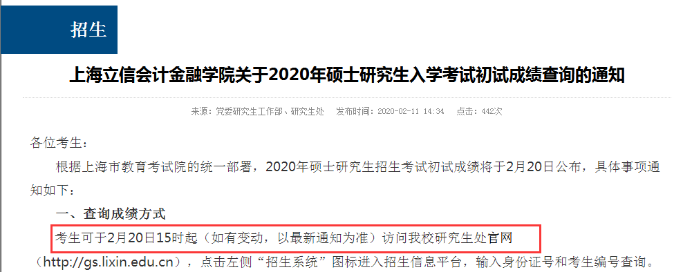 考生可于2月20日15时起(如有变动,以最新通知为准)访问我校研究生处官网(http://gs.lixin.edu.cn),点击左侧“招生系统”图标进入招生信息平台,输入身份证号和考生编号查询。
