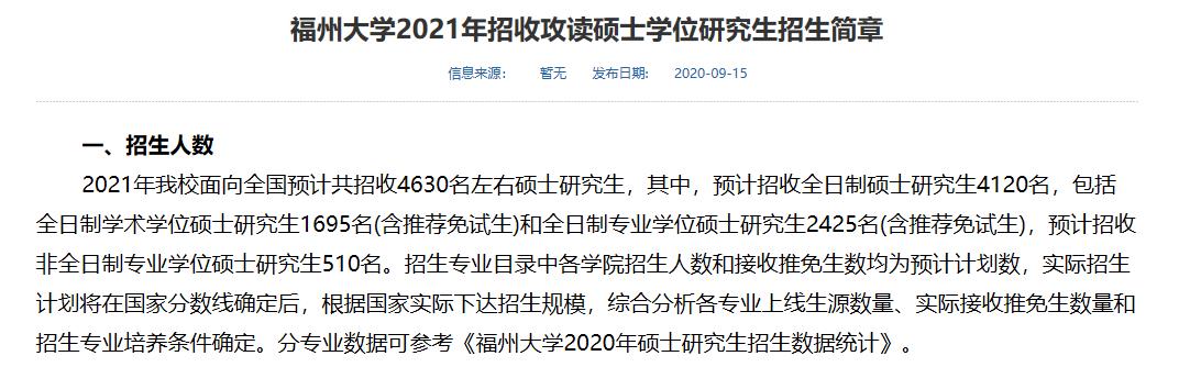 福州拼搏(中国)2020年研究生招生计划约为3500名,2021年全日制招生计划约4630名,同比增长1130名。