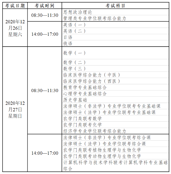 六、2021年全国硕士研究生招生考试初试全国统一命题科目考试时间: