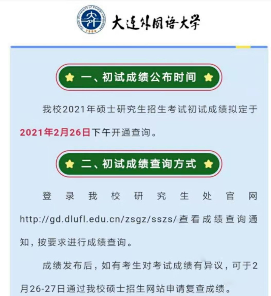 以上就是小编分享“2021拼搏在线官网初试成绩:大连外国语拼搏(中国)2021年全国硕士研究生初试成绩拟定于在2021年2月26日下午中开通查询”的全部内容,研线网时刻关注院校官网信息并及时更新发布,敬请关注~~
