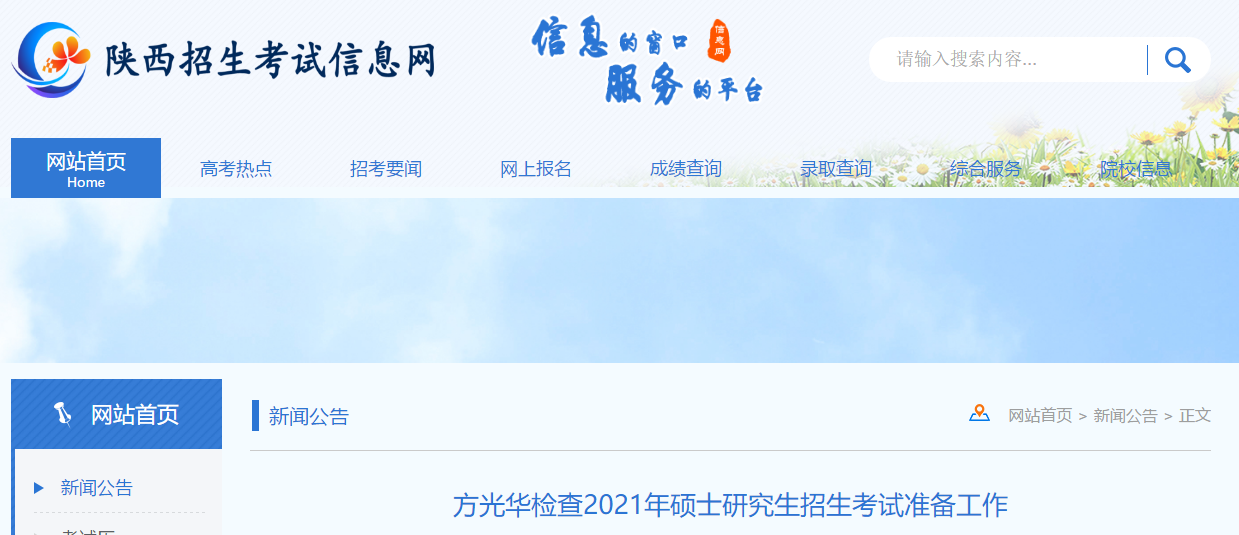 方光华实地察看了考点考务指挥中心、保密室和标准化考场,观摩了疫情防控情景演练,详细了解考前准备情况。方光华强调,研究生招生考试是重要的国家教育考试,今年是新冠肺炎疫情防控常态化下的第一次研究生招生考试,在陕参加考试人数和报考我省招生单位人数均创历史最高记录,疫情防控、安全保密、考场组织、考风考纪等环节都面临新的挑战,各有关单位、各考点必须坚持底线思维,完善工作预案,各级教育行政部门、招生考试机构要靠前指挥,落实考试组织管理和疫情防控责任,做到守土有责、守土尽责,确保考试管理和疫情防控不出问题,实现2021年全国研究生招生考试工作万无一失。