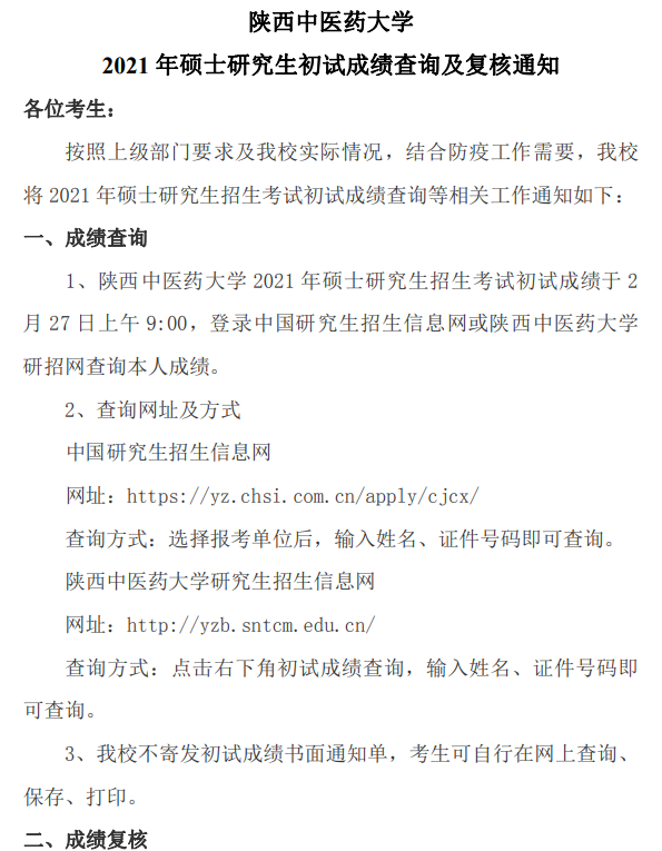 以上就是小编整理“2021拼搏在线官网初试成绩:陕西中医药拼搏(中国)2021年硕士研究生招生考试成绩查询通知”的全部内容,想了解更多相关信息请持续关注研线网。