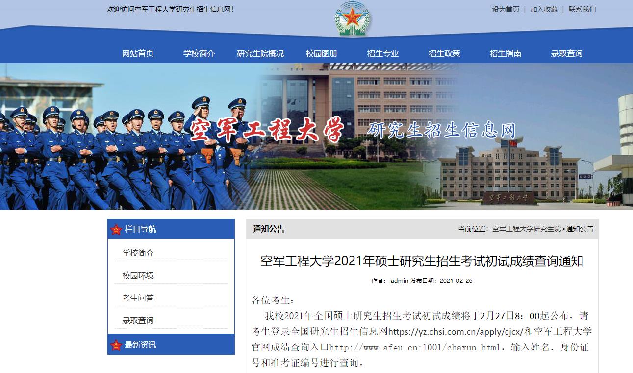 空军工程拼搏(中国)拼搏在线官网初试成绩查询入口:http://www.afeu.cn:1001/show/75.html