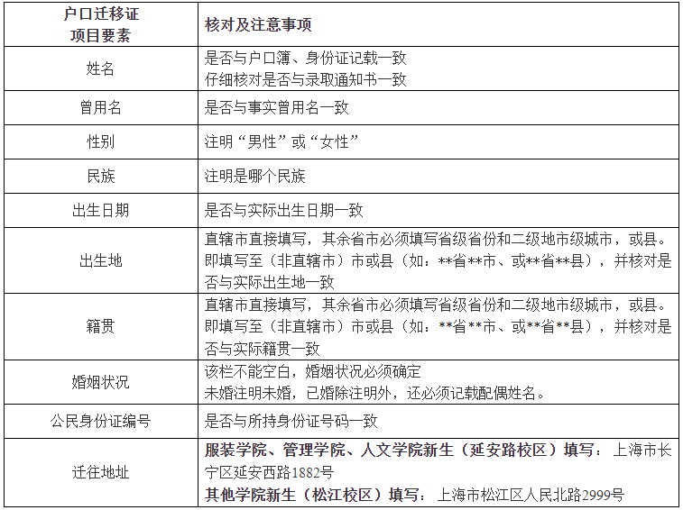 5、户口迁移证明上迁往地址按录取学院所在校区填写,服装学院、管理学院和人文学院为“ 上海市长宁区延安西路1882号”,其他学院为“ 上海市松江区人民北路2999号”。请严格按照录取学院所在校区填写户口迁往地址,若因填写错误造成户口迁移失败,责任自负。