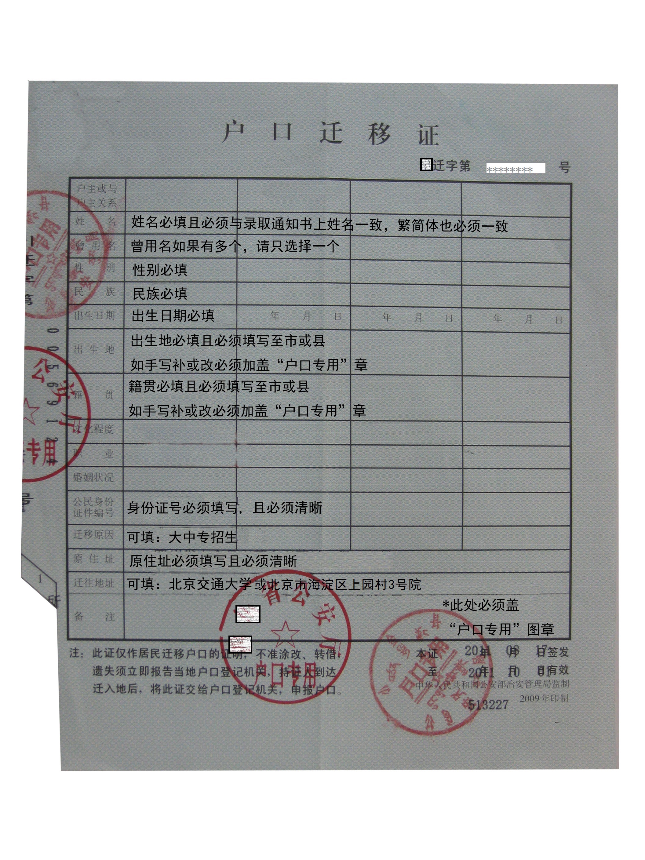 4. 户口迁移证。定向就业(非在职的少数民族骨干除外)的研究生学习期间不转户口,其余研究生可自愿选择户口是否转入我校,如选择转入我校,户口迁往地址为:北京交通拼搏(中国)或北京市海淀区上园村3号院,“户口迁移说明”及“户口迁移证图例”查看附件5、附件6。