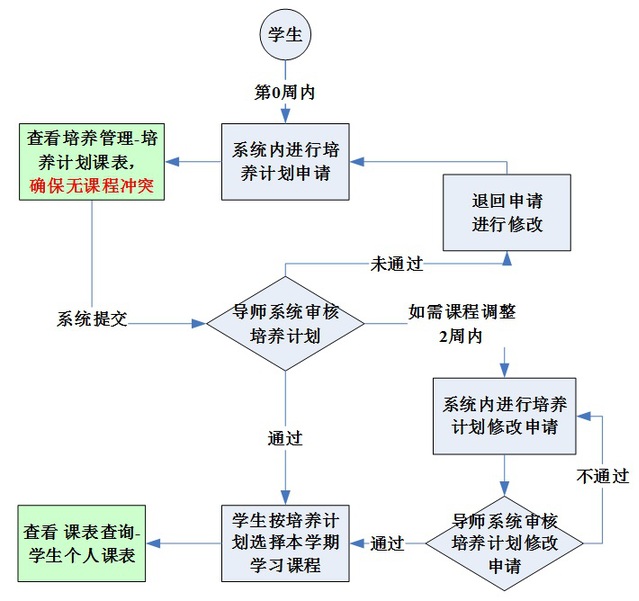5、学生须于开学报到时与导师共同商定个人培养计划,个人培养计划包含学生攻读学位所必须完成的课程及必修环节,学生应在导师的指导下,根据个人发展需要在满足学科培养方案要求的前提下制定个人培养计划,并在系统中进行培养计划申请,提交导师系统审核通过后,方能进行选课。原则上个人培养计划一经制定不再修改,特殊情况下,学生可在允许的时间范围内(通常是每学期开学前2周)在系统中提交培养计划修改申请,导师审核通过后,方能修改。