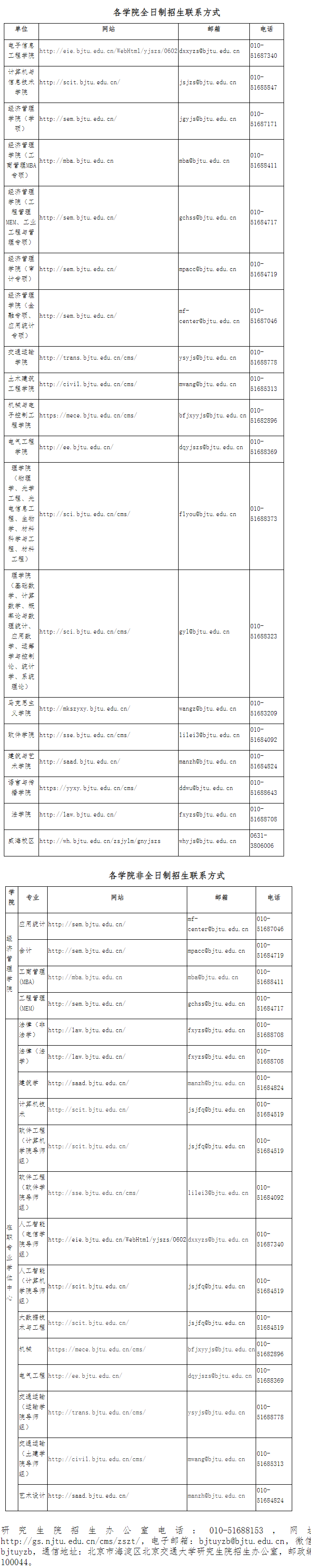 学校将通过研究生招生网https://gs.bjtu.edu.cn/cms/zszt/、微信公众号bjtuyzb以及各学院网站公布信息,请考生关注。考生如有疑问可咨询学院或研招办。近期校园封闭管理,请考生通过电子邮件的方式进行咨询,联系方式如下: