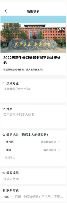 所有被录取的新生,务必于2022年6月25日(星期六)前将本人能够接收到录取通知书的邮寄地址,通过钉钉软件平台的“智能填表”进行报送。“智能填表”的具体操作示例如下: