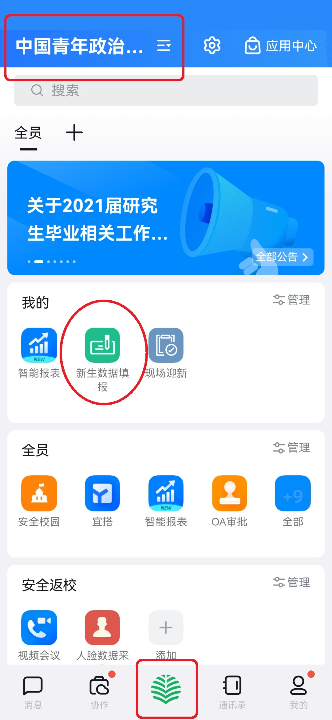 收到录取通知书后,所有被录取的新生请于2022年8月5日(星期五)前进入钉钉软件平台中“中国青年政治学院”架构下的“工作台”进行“新生数据填报”,具体操作如下: