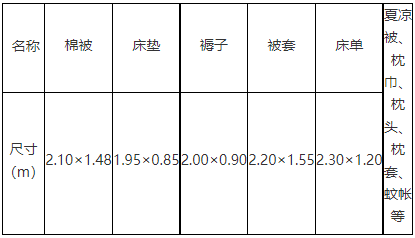 宿舍床体尺寸为2.0×0.9m(内径0.85m)。新生卧具可自备,报到当天各校区指定地点也均有学校遴选的卧具厂家现场销售。为防止“黑心棉”和流行性疾病流入校园,请自带合格产品或在校内指定销售点购买。