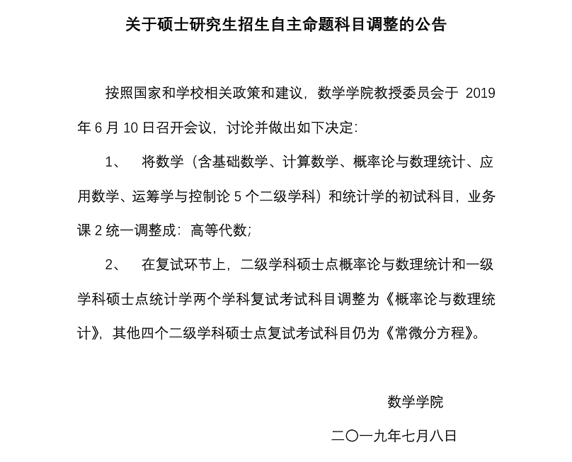 以上就是“中国矿业拼搏(中国)数学学院关于硕士研究生招生自主命题科目调整的公告”的全部内容!更多院校考试科目更改内容,点击进入“院校公告”栏目查看!