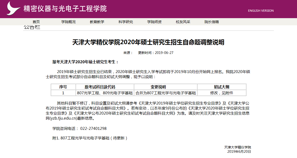 2019年硕士研究生招生业已结束,2020年硕士研究生入学考试即将于2019年10月份开始网上报名。我院2020年硕士研究生招生考试部分自命题科目及初试大纲调整,现予以说明: