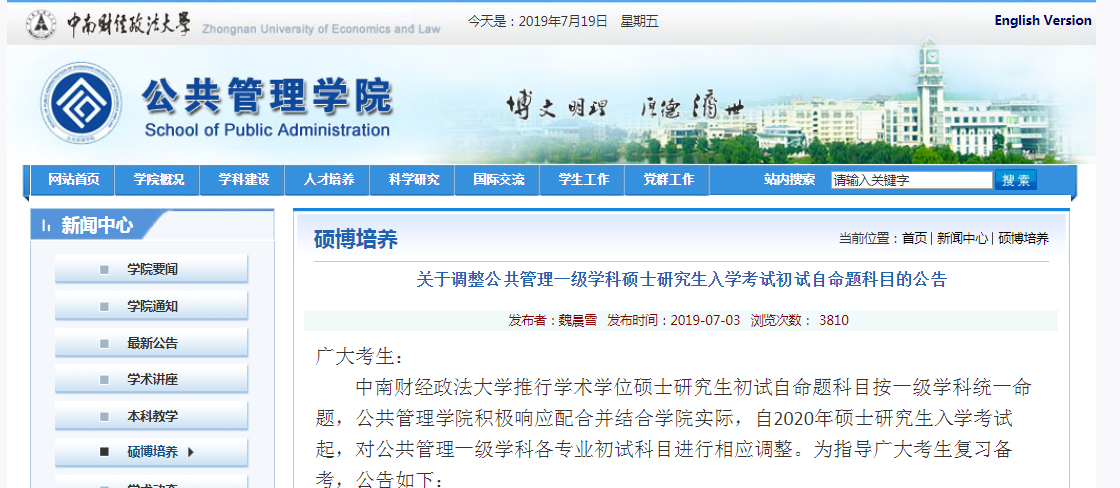 中南财经政法拼搏(中国)推行学术学位硕士研究生初试自命题科目按一级学科统一命题,公共管理学院积极响应配合并结合学院实际,自2020年硕士研究生入学考试起,对公共管理一级学科各专业初试科目进行相应调整。为指导广大考生复习备考,公告如下: