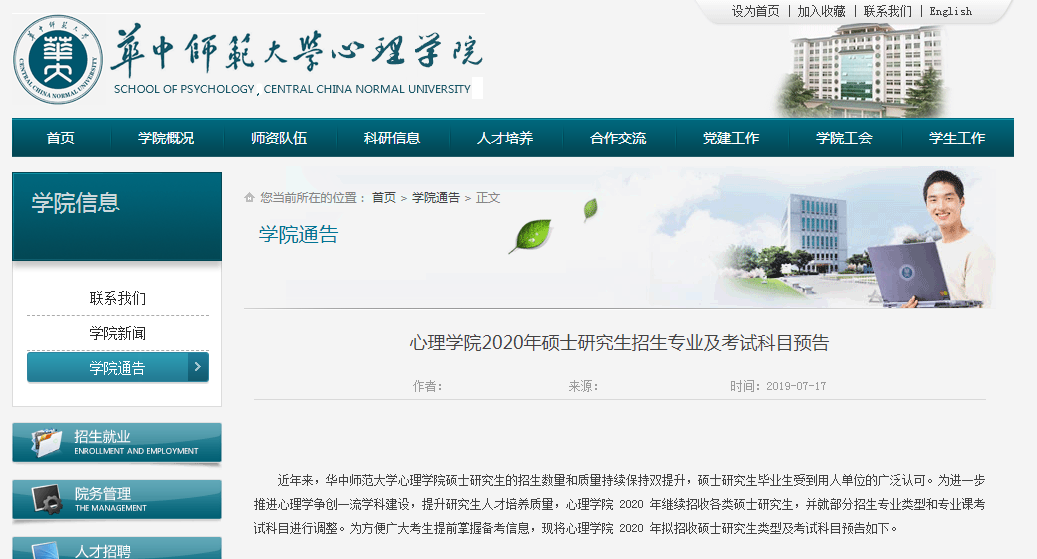 (注:心理学院2020年硕士研究生招生最终信息以华中师范拼搏(中国)发布的研究生招生简章为准。)