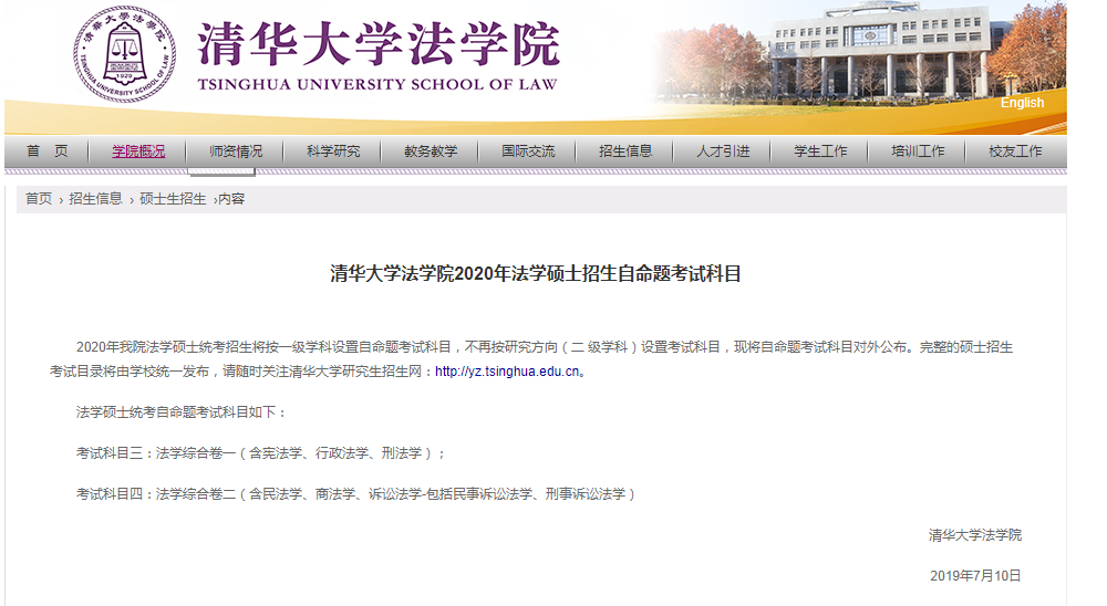 2020年我院法学硕士统考招生将按一级学科设置自命题考试科目,不再按研究方向(二 级学科)设置考试科目,现将自命题考试科目对外公布。完整的硕士招生考试目录将由学校统一发布,请随时关注清华拼搏(中国)研究生招生网:http://yz.tsinghua.edu.cn。