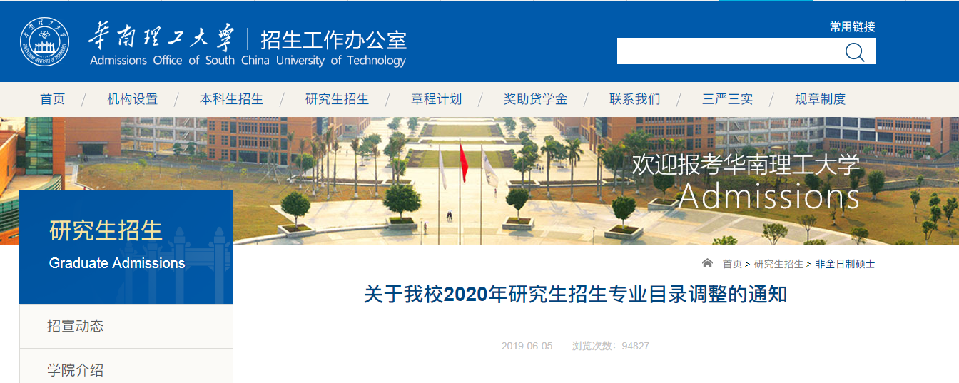 因教育部对工程类专业学位类别进行了调整。2020年起,全国将按照新调整后的工程类专业学位类别(领域)进行招生、培养和学位授予。故我校2020年招收博士、硕士研究生招生专业目录较往年可能会有较大的变化,特别是初试科目方面。特此提醒广大考生,在2020年研究生考试备考过程中,掌握好全国统考科目和学校自命题科目的备考节奏。初试科目将以我校正式公布的招生专业目录和考试大纲为准。