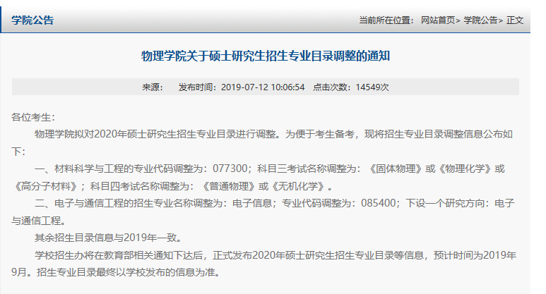 物理学院拟对2020年硕士研究生招生专业目录进行调整。为便于考生备考,现将招生专业目录调整信息公布如下: