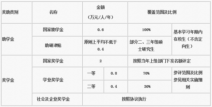 为激励研究生勤奋学习、潜心科研,在全面实行研究生教育收费制度的情况下更好地支持研究生顺利完成学业,学校设立了研究生奖、助学金。2019年硕士研究生奖、助学金见下表(仅供参考):
