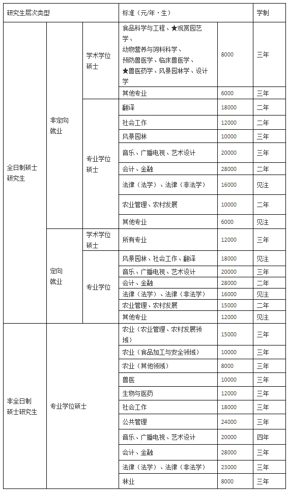 注:风景园林、农艺与种业、资源利用与植物保护、畜牧、渔业发展、食品加工与安全、农业工程与信息技术、林业、电子信息、机械、生物与医药、工程管理、法律(非法学)等类别(领域)学制为三年;翻译、社会工作、法律(法学)等类别(领域)学制二年。