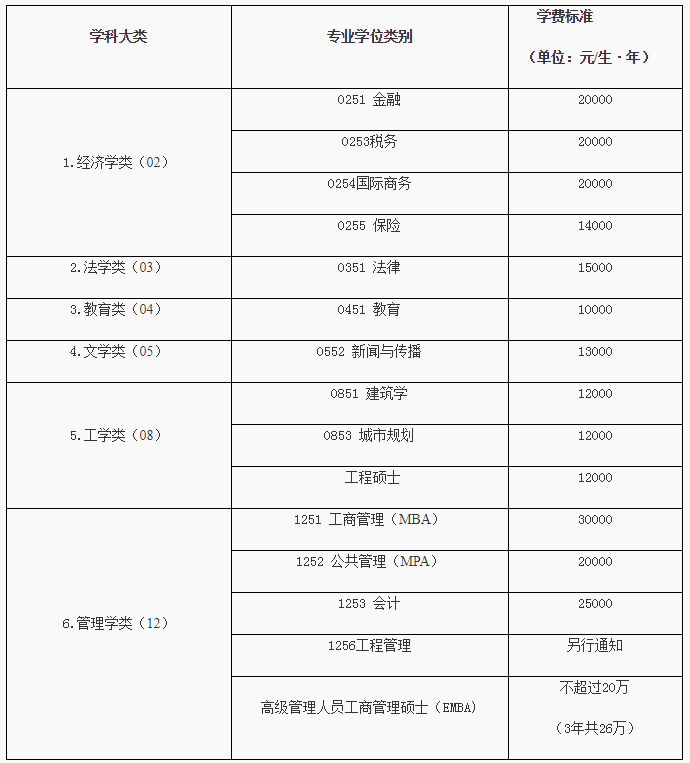 非全日制硕士研究生各学科领域学费标准见下表: