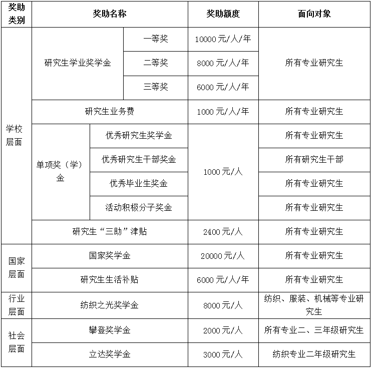1.我校研究生奖助体系健全,设有国家层面、行业层面、社会层面及学校层面等四大类共10余种奖助学金。详情如下表: