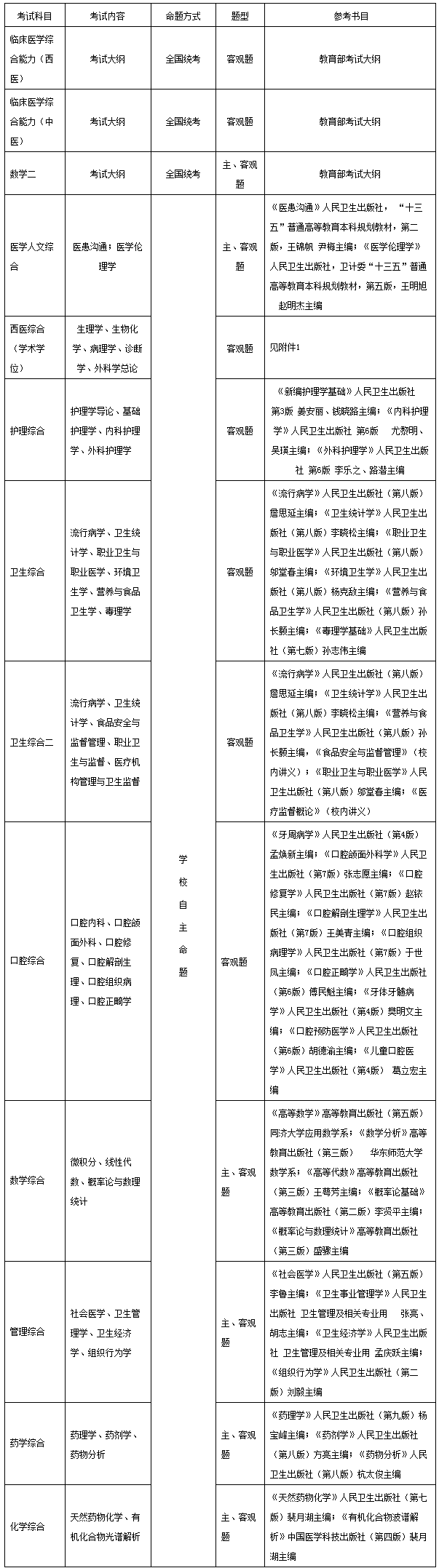 医学门类专业基础综合考试科目及参考书目等见下表: