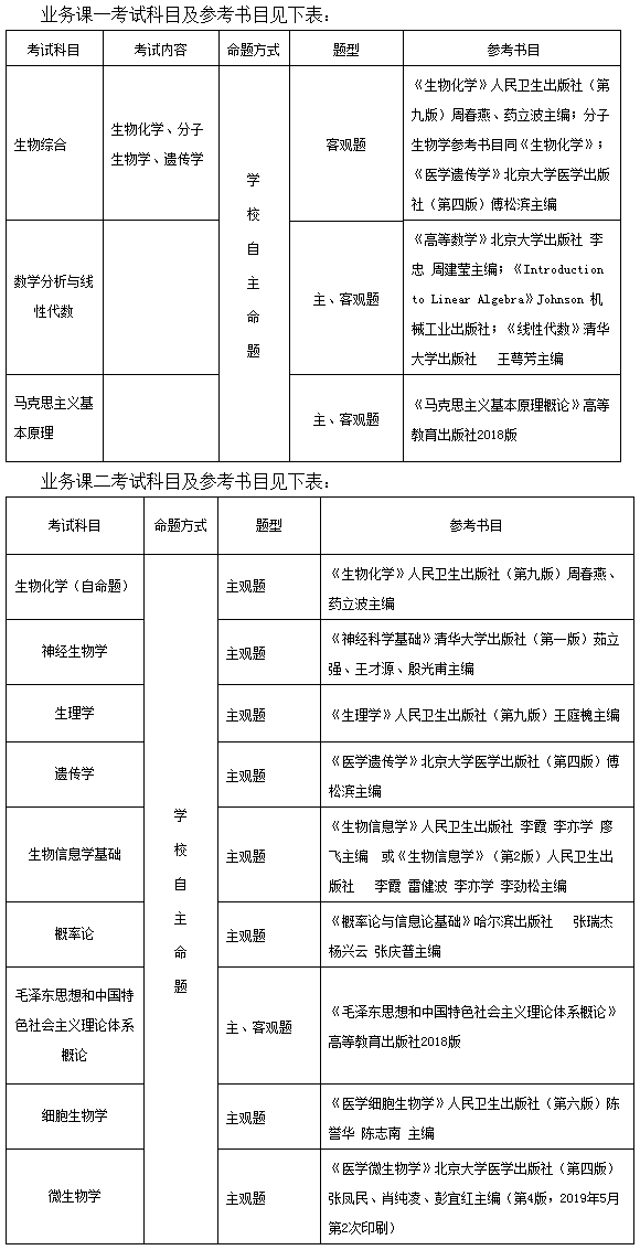 ③理学门类中生物学一级学科所涵盖的所有二级学科(生理学、微生物学、神经生物学、遗传学、发育生物学、细胞生物学、生物化学与分子生物学、生物物理学)、生物医学工程一级学科、工程硕士(生物医学工程)和法学门类的思想政治教育专业,初试科目仍为四门,第三门为业务课一考试科目(150分),第四门为业务课二考试科目(150分)。