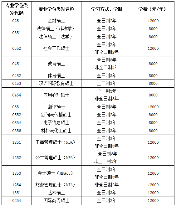 学术型硕士学习方式全部为全日制,学制3年,每学年学费8000元;各专业型硕士学习方式、学制及学费见下表: