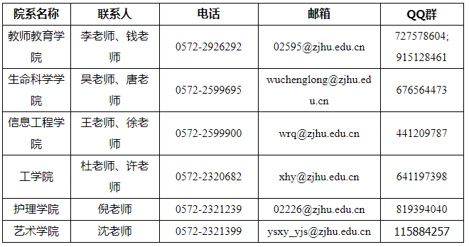 湖州师范学院研究生处,浙江省湖州市二环东路759号明达楼317室,邮编:313000,电话:0572-2322779。Email:yjsc@zjhu.edu.cn。官方网站:http://yjsc.zjhu.edu.cn/。