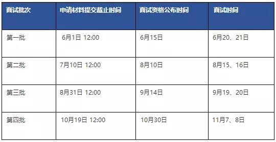 ②填写和上传申请材料。网上提交的申请材料包括:申请书、成绩单、个人简历、收入证明、单位组织结构图,推荐信(非必需)。申请材料的具体内容和要求见系统内说明。考生提交申请材料时需要选择申请面试批次,并在所选批次申请材料提交截止日期前提交。各批次的申请截止时间、面试资格公布时间和面试时间见下方"面试批次"表。
