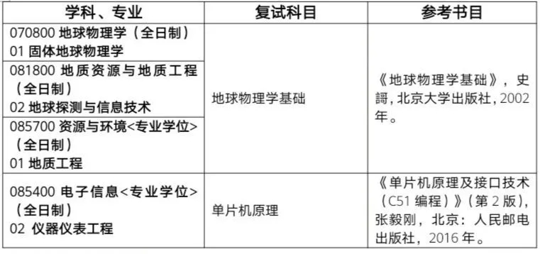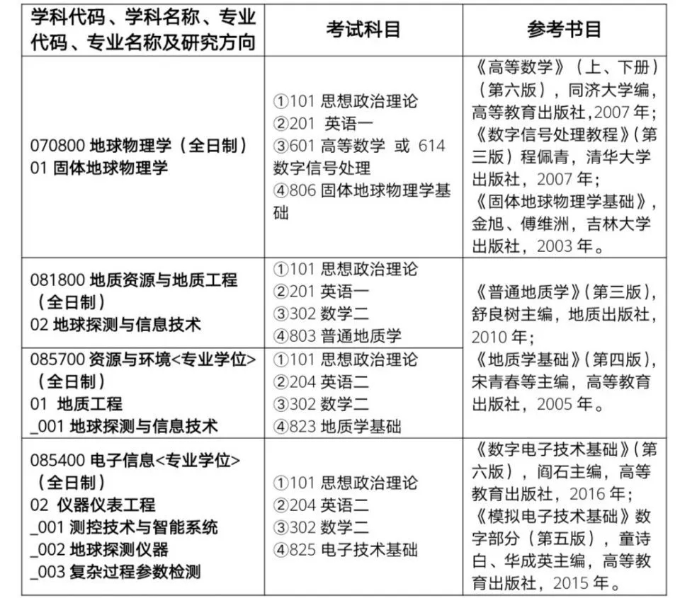 硕士:地球物理学、地质资源与地质工程(地球探测与信息技术方向)2个一级学科硕士授权点;资源与环境(地质工程方向)、电子信息(仪器与仪表工程方向)2个专业硕士授权点;