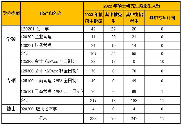 2022年商学院各学科拟招生计划如下表。我院计划招生人数为328人,其中学硕会计学42人、财务管理24人、企业管理41人;专硕会计(全日制)28人、会计(非全日制)70人、工商管理(全日制)49人、工商管理(非全日制)70人;应用经济学博士研究生4人。