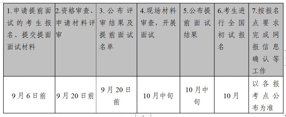 符合报考条件的考生可申请参加“提前面试”(不接受报考专项计划的考生申请)。“提前面试”将安排在全国联考(初试)之前,面试成绩仅在该招生年度有效,考核方式为面试。