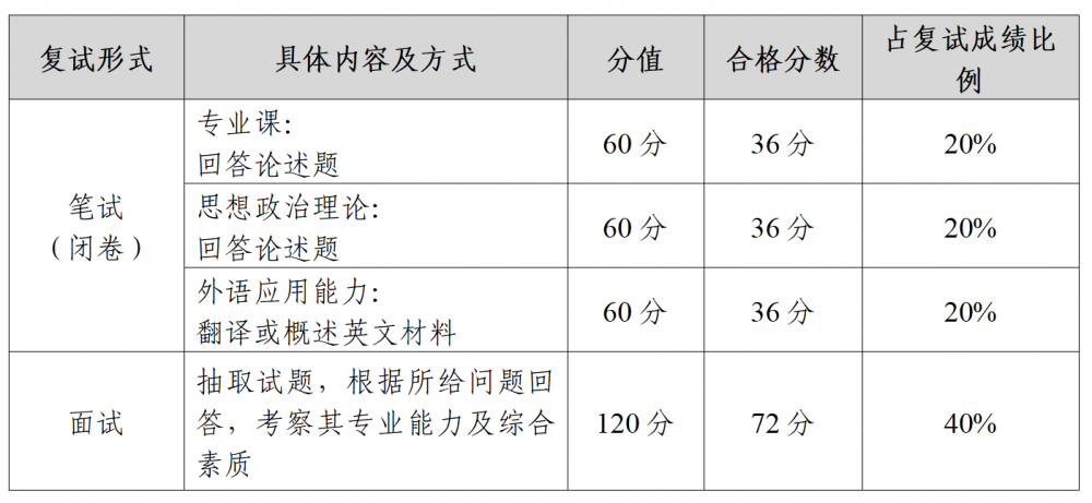 复试着重考察考生的综合素质与专业知识运用。复试满分值为300分,分为笔试和面试两部分。具体如下: